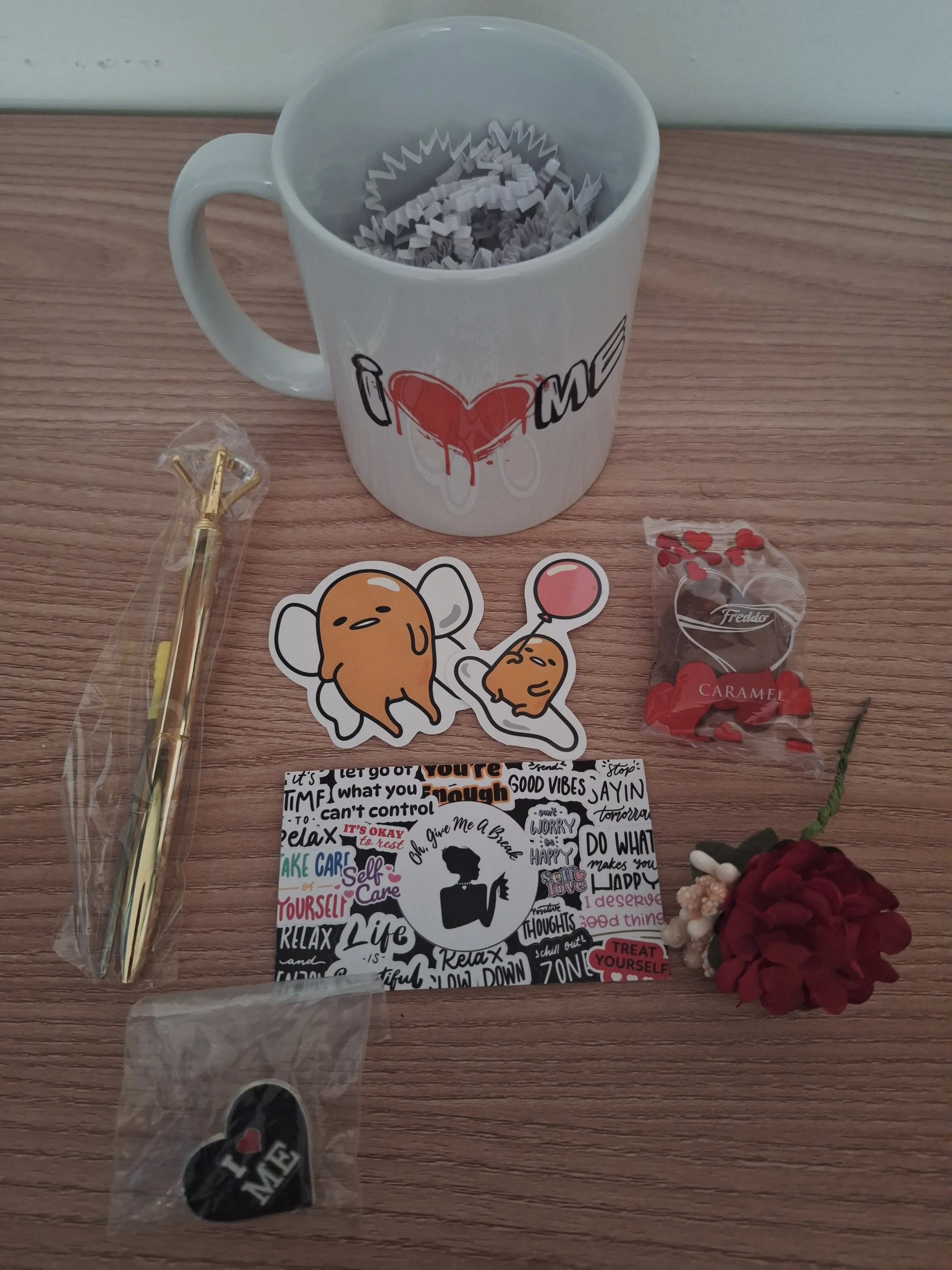 Let the world, and even yourself, know that you're on a new journey. A self-ish care journey! With this self-ish care kit, you'll wear your self-ish care with pride, and most importantly, comfort. If that's not enough, we've got a pair of fuzzy socks to match, and a sweet treat for you too!