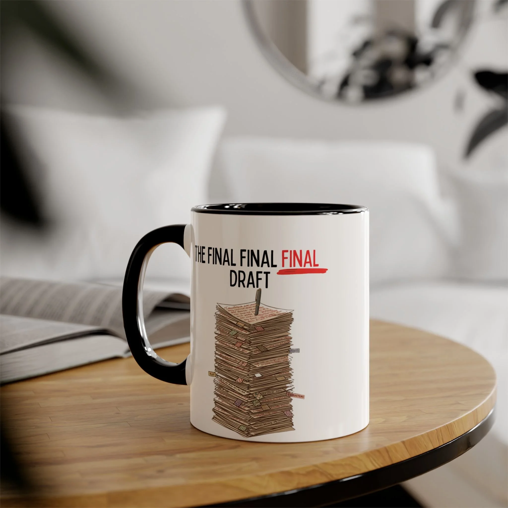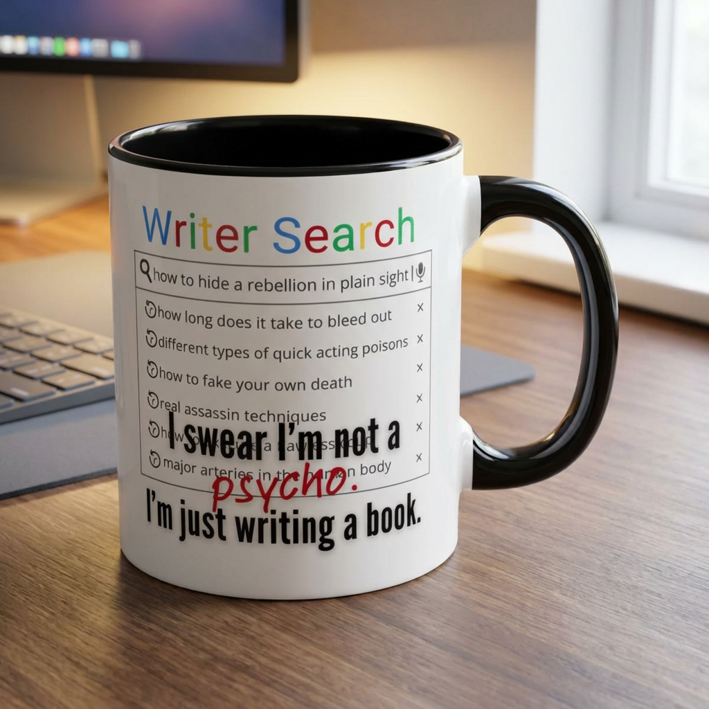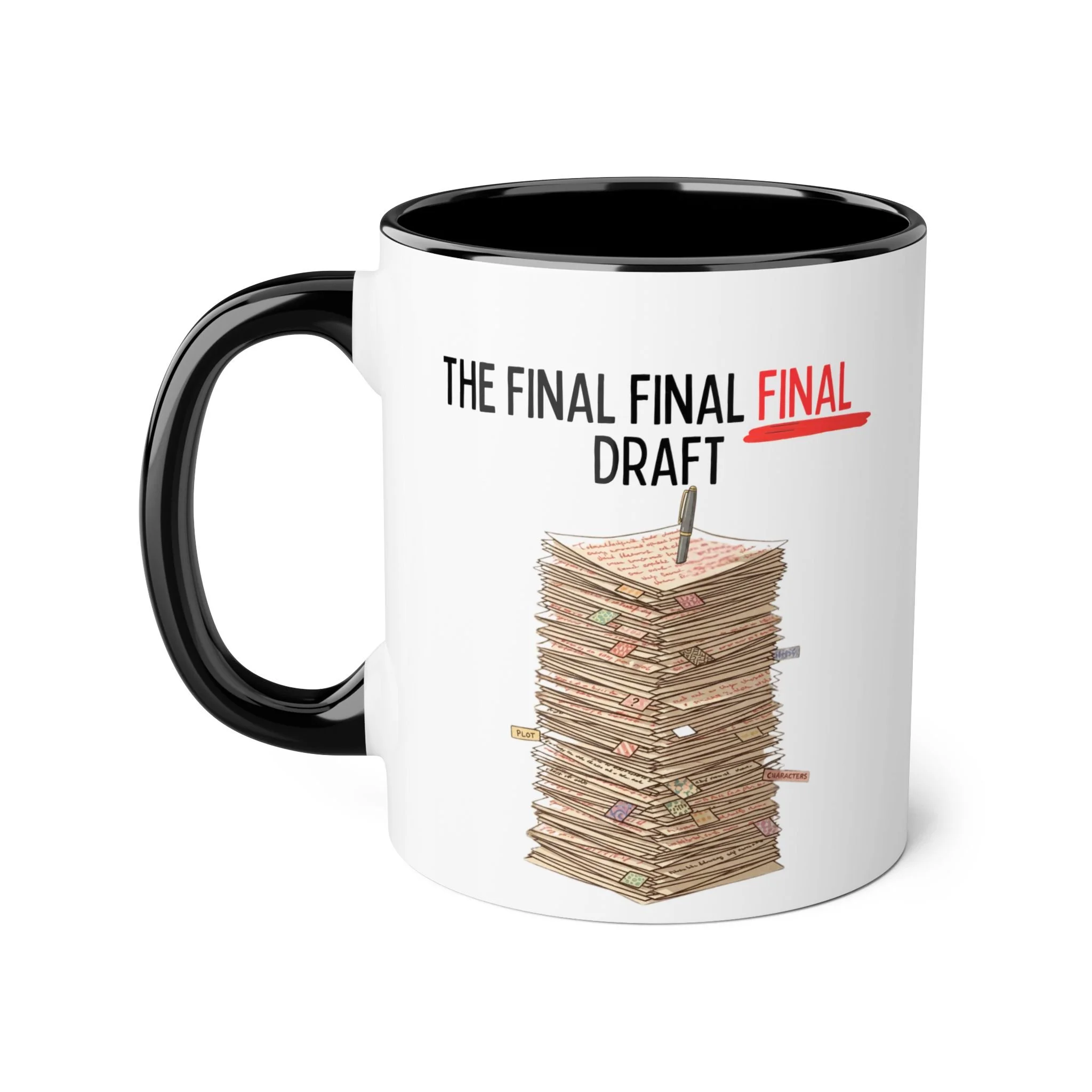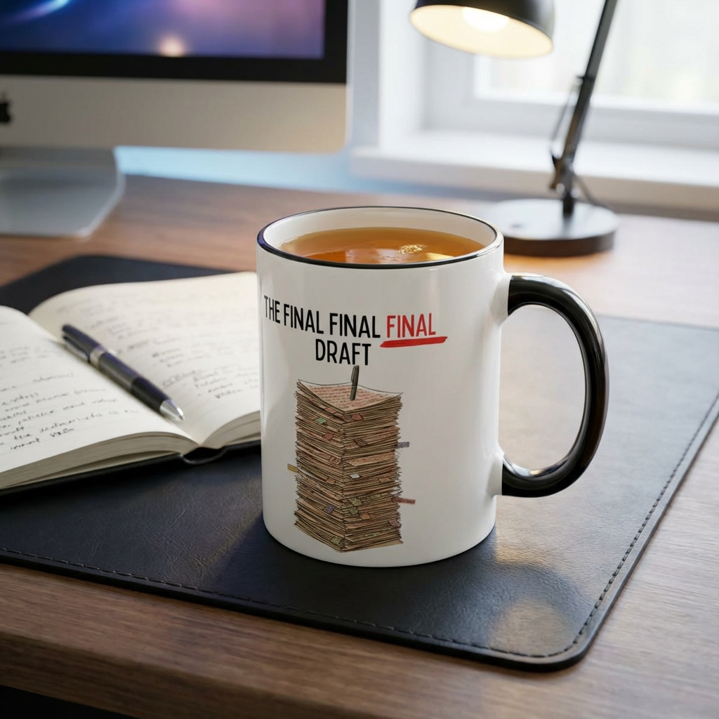 We’ve all been there—dealing with the draft that refuses to be finished. Perfectly capturing that "just one more change" energy every writer knows all too well, this mug is a tribute to the creative struggle. Featuring a towering stack of papers overflowing with sticky notes, red ink, and a lone pen standing tall like a flag at the summit.
